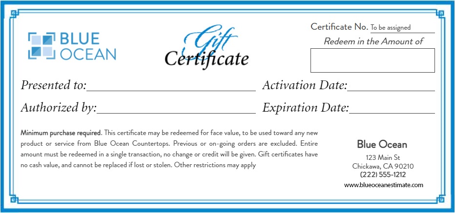 Minimum purchase required. This certificate may be redeemed for face value, to be used toward any new product or service from Blue Ocean. Previous or on-going orders are excluded. Entire amount must be redeemed in a single transaction, no change or credit will be given. Gift certificates have no cash value, and cannot be replaced if lost or stolen. Other restrictions may apply